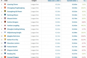 體育資訊6月25日訊 日前,德國轉會市場網站統計了更新后的中甲球隊身價排行。
