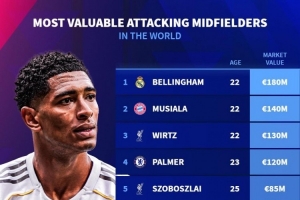體育資訊11月2日訊 德國轉(zhuǎn)會市場列出了進(jìn)攻型中場身價排名,貝林厄姆1.8億歐居首,穆西亞拉1.4億歐次席。
