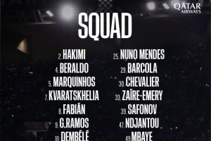 前鋒:7-克瓦拉茨赫利亞、9-貢薩洛-拉莫斯、10-登貝萊、19-李剛?cè)省?9-巴爾科拉、47-恩賈恩圖、49-姆巴耶