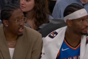 比賽最后時(shí)刻,鏡頭給到板凳席上的雷霆眾將,亞歷山大和仍在養(yǎng)傷的杰倫-威廉姆斯神同步。
