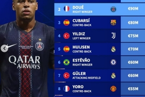 體育資訊11月5日訊 杜埃榮膺2025年金童獎,德轉也盤點了足壇U20球員身價榜,具體如下: