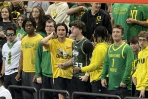 今日俄勒岡大學(xué)以67-63戰(zhàn)勝萊斯大學(xué),取得開季兩連勝,小吧來(lái)到現(xiàn)場(chǎng)觀戰(zhàn),看到現(xiàn)場(chǎng)有很多林葳的球迷,一個(gè)外國(guó)人還穿著同曦球衣。