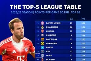 2025/26賽季五大聯(lián)賽球隊場均積分榜: