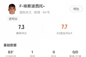 體育資訊6月26日訊 世俱杯小組賽,E組第3輪,國米2比0擊敗河床。其中巴斯托尼打滿全場,并為球隊攻進鎖定勝局1球。賽后媒體為巴斯托尼打出評分8分,他也被評分本場最佳球員。