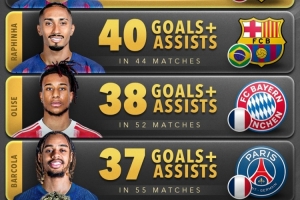 體育資訊11月10日訊 Score90統(tǒng)計了2025年五大聯(lián)賽邊鋒在俱樂部+國家隊比賽中參與進(jìn)球的數(shù)量,并列出榜單。