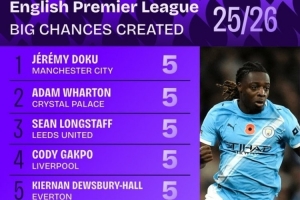 體育資訊11月11日訊 英超聯賽已經進行了11輪,squakwa也統計了本賽季英超創造重大機會情況,多達8人并列居首。