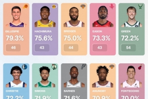 注:至少出手40次接球投籃;有效命中率=(命中數(shù)+0.5×三分命中數(shù))/出手?jǐn)?shù)