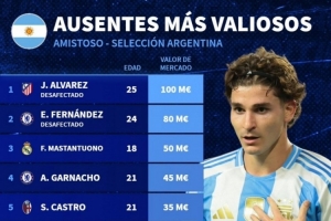 體育資訊11月12日訊 德國轉會市場統計了缺席本期阿根廷隊球員的身價,并列出榜單,阿爾瓦雷斯1億歐居首,恩佐-費爾南德斯8000萬歐次席。