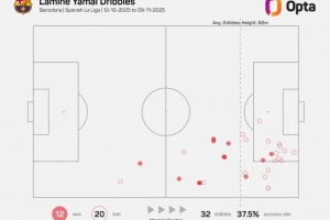 Opta指出,10月12日以來,亞馬爾聯賽嘗試過人32次,與圖盧茲球員博霍并列五大聯賽最多,過人成功率37.5%。