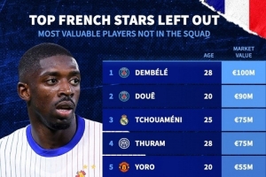 體育資訊11月14日訊 德國轉會市場統(tǒng)計了無緣本期法國隊名單球員的身價,并列出榜單,登貝萊1億歐居首。