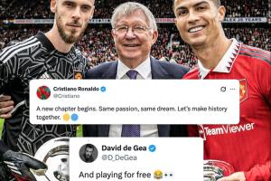 C羅在社媒曬出與利雅得勝利的續(xù)約照,并配文:“新的篇章就此開(kāi)啟。同樣的激情,同樣的夢(mèng)想。讓我們攜手共創(chuàng)歷史。”他的老隊(duì)友德赫亞則在評(píng)論區(qū)回復(fù)道:“免費(fèi)踢球(And playing for free)????”