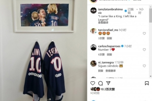 伊布社媒曬出他在巴黎照片,他懷中的兩個孩子身穿的球衣分別帶有“王者”、“傳奇”的字樣,伊布配文:“我來時如王者,去時成傳奇。”