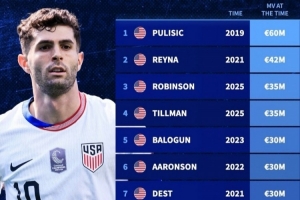 體育資訊11月16日訊 德國轉(zhuǎn)會(huì)市場(chǎng)盤點(diǎn)了美國球員歷史身價(jià)排名,2019年的普利西奇以6000萬歐元排名第一。