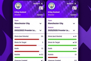 體育資訊11月18日訊 Squawka統(tǒng)計了哈蘭德22-23賽季(英超36球創(chuàng)紀(jì)錄)和本賽季的數(shù)據(jù),并做出對比。