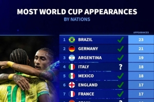 體育資訊11月18日訊 德國轉會市場統計了各國參加世界杯決賽圈階段比賽的次數,并列出榜單,巴西23次居首,德國、阿根廷二三位。