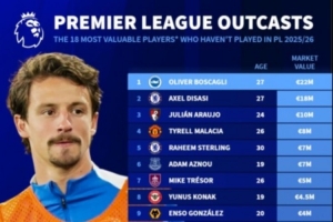 體育資訊11月19日訊 本賽季英超已經進行了11輪,德轉列至今仍未出場球員身價排行,布萊頓后衛博斯卡利2000萬歐居首,切爾西后衛迪薩西1800萬歐第二。