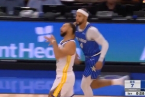 GIF-庫里投中三分后扮鬼臉嘲諷薩格斯