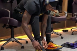 賽前,詹姆斯在更衣室哼著小曲,同時穿上了他最新一代簽名鞋“詹23”。這將是詹姆斯首次在正式比賽中穿這雙鞋。