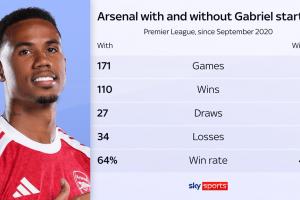 據(jù)天空體育統(tǒng)計,阿森納在沒有加布里埃爾的情況下,勝率下跌多達24%。