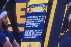 比賽首節主場展示以賽亞-杰克遜數據寫道:“以賽亞·杰克遜在對陣活塞時砍下16分10籃板,拿到賽季第三次兩雙,邁爾斯·特納在雄鹿還沒拿過兩雙。”