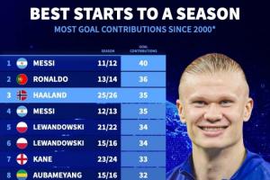 體育資訊11月20日訊 德轉統計了本世紀賽季開局的進球貢獻數,哈蘭德以35粒進球位居歷史第三,僅次于梅西和C羅。