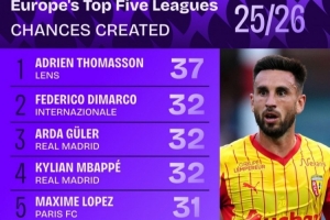 體育資訊11月22日訊 五大聯賽戰火即將重燃,數據機構squakwa也統計了本賽季至今的五大聯賽球員創造機會次數情況,朗斯中場阿德里安·托馬森居首。