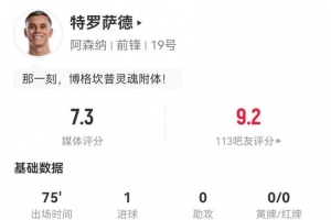 體育資訊11月24日訊 阿森納在本輪英超4-1領先熱刺,特羅薩德本場數據如下: