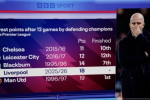 利物浦本賽季英超前12輪比賽僅積18分,成為英超歷史同期積分第四少的衛冕冠軍。