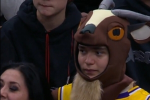 比賽期間鏡頭抓拍到場邊一位女球迷身穿詹姆斯球衣并戴著山羊(GOAT)帽子。