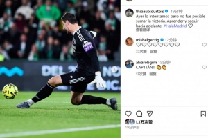 皇馬門將庫爾圖瓦社媒曬出比賽照片,配文:“昨天我們拼盡全力,但未能贏得勝利,我們會吸取教訓,繼續前進。”