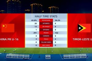 體育資訊11月24日訊 U17亞洲杯預選賽A組第二輪,中國隊半場6-0領先東帝汶。數據統計顯示,上半場形勢完全一邊倒。