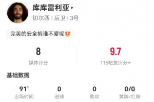 體育資訊11月26日訊 切爾西在本輪歐冠3-0完勝巴薩,庫庫雷利亞本場數據如下: