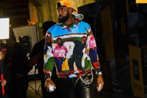 賽前,湖人官推曬球員入場照,詹姆斯花哨著裝十分吸引眼球,東契奇墨鏡酷帥。