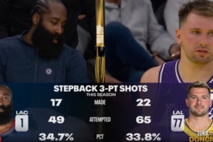 現場轉播方曬出本賽季后撤步三分統計:哈登49投17中,命中率34.7%;東契奇65投22中,命中率33.8%。