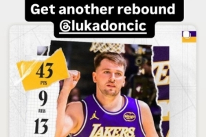 賽后湖人球員拉拉維亞曬出東契奇的數據海報,他調侃道:“你多搶個籃板啊。”
