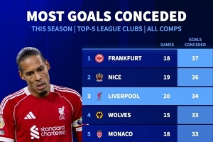 體育資訊11月27日訊 德國轉(zhuǎn)會市場統(tǒng)計了本賽季五大聯(lián)賽球隊的失球數(shù)量,并列出榜單,法蘭克福丟37球最多,利物浦丟34球第三。