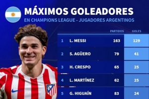 體育資訊11月28日訊 德國轉會市場統計了阿根廷球員在歐冠比賽中的進球數量,并列出榜單,梅西129球居首,阿圭羅次席,阿爾瓦雷斯18球第9。