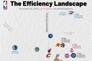 橫軸代表進攻效率,越靠右越好,縱軸代表防守效率,越靠上越強。第一象限的球隊多為發揮出色的球隊,而在第三象限的球隊通常為戰績比較糟糕的球隊。
