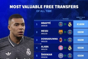 體育資訊11月29日訊 德國轉會市場列出了自由轉會球員身價排名,姆巴佩1.8億歐居首,梅西8000萬歐次席。
