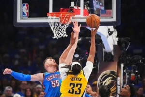 針對首場絕殺的哈利伯頓,雷霆也用了心思:哈騰雖然首節挨了他一個遠射,但此后多次撲出禁區,在三分線就對上哈利伯頓,避免哈利伯頓的持續滲透。特納下半場中投帶扣籃頗為威風,代價是哈利伯頓前三節只得5分。