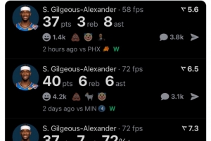 賽后美媒Real Sports曬出了亞歷山大近三戰數據,寫道:“SGA應進入歷史級別得手的討論。”