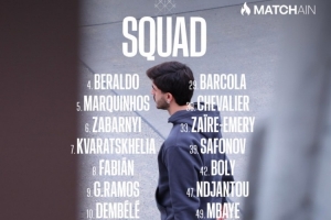 前鋒:7-克瓦拉茨赫利亞、9-貢薩洛·拉莫斯、10-登貝萊、19-李剛?cè)省?9-巴爾科拉、47-恩賈恩圖、49-姆巴耶