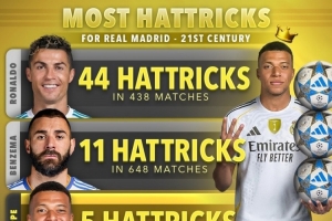 體育資訊11月29日訊 Score90統計了本世紀球員在皇馬上演帽子戲法的次數,并列出榜單,C羅44次居首,本澤馬11次第二,姆巴佩5次。