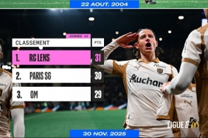 體育資訊12月1日訊 法甲第14輪,朗斯客場2-1擊敗昂熱,14輪過后10勝1平3負31分位列法甲積分榜首位。
