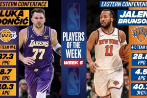 體育資訊12月2日訊 今日NBA官方宣布,湖人球星東契奇與尼克斯球星布倫森分別當選NBA上周西部和東部周最佳球員。