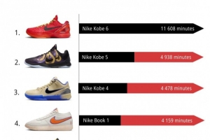 體育資訊12月2日訊 球鞋媒體kixstats統計了11月份NBA球員上腳球鞋的總時長排行,其中科比的三款球鞋霸榜前三,Kobe 6更是斷檔第一。