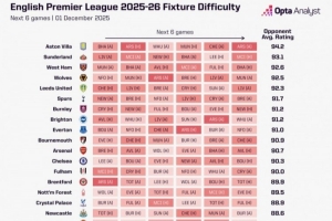 體育資訊12月2日訊 opta分析了英超各隊(duì)未來6輪的賽程難易程度,維拉賽程最為艱難,利物浦最容易。曼城第二容易,曼聯(lián)并列第三容易。