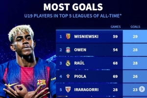 體育資訊12月2日訊 巴薩在本賽季西甲領(lǐng)跑積分榜,亞馬爾14場貢獻7球8助攻,其中西甲10場5球7助攻。數(shù)據(jù)統(tǒng)計顯示,他也已經(jīng)是五大聯(lián)賽歷史U19射手榜前十。