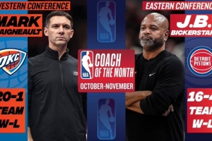 體育資訊12月3日訊 今日NBA官方公布了10-11月東西部月最佳主帥,雷霆主帥戴格諾特與活塞主帥比克斯塔夫當選。