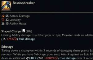 你過去三秒內傷害過的敵方英雄死亡會為你提供一個破壞效果,你對史詩級野怪或者防御塔的下一次攻擊會消耗掉這個效果,造成基于穿甲的額外持續傷害